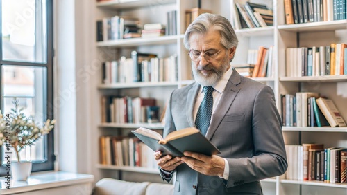 president or business man relaxing and reading in front of a bookshelf, copy space