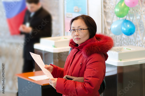 presidential, election, russia, federation, woman, asian, ballot, elector, hold, voting, paper, look, camera, pose, citizen, vote, goggles, 40s, red, coat, march, 4, 2012, local, polling, station, electronic, box, upper, half, portrait, indoor, 2, person, political, event, observer, editorial