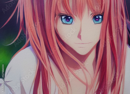 Pretty anime girl portrait. Beautiful woman oil painting print. Fantasy female character cartoon illustration. Graphic digital art avatar