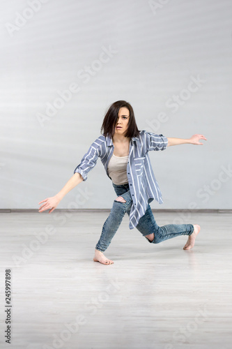 Pretty dancer girl in movement. Beautiful slim girl performing modern dance on studio background. School of young talented dancers.