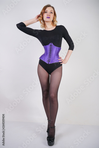 pretty fashionable blonde girl wearing black jumpsuit with mesh pantyhose and purple corset on white background