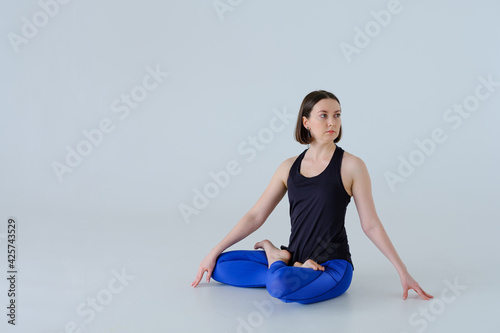 Pretty female yoga instructor in blue sports leggings and black top, is demonstrating body twists in lotus position, padmasana on white background isolated on cyclorama. Copy space text.