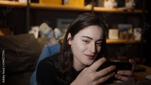 Pretty girl is lying on the sofa and playing games or watching videos with her mobile smart phone in hand, social life and technology concept