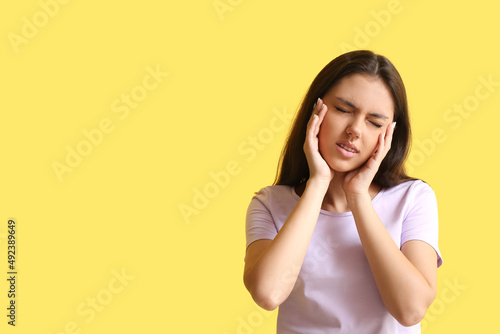 Pretty teenage girl with dental braces suffering from toothache on yellow background