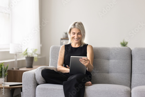 Pretty woman sits on sofa using digital tablet, explore website, social media platform, online forums to stay updated on news, chat with friends, read articles, and digital magazines via application