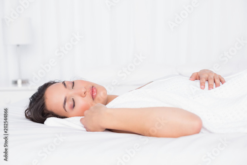 bedchamber, bed, sleeping, resting, domestic life, comfortable, relaxation, peaceful, home, house, lying, face, pretty, beautiful, beauty, brunette, brown hair, attractive, eyes closed, relaxing, bright, asleep, white, sheet, comforter, duvet