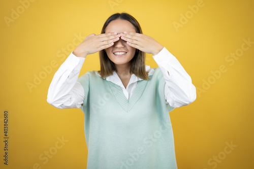Pretty young woman standing over yellow background covering eyes with hands smiling cheerful and funny. Blind concept.