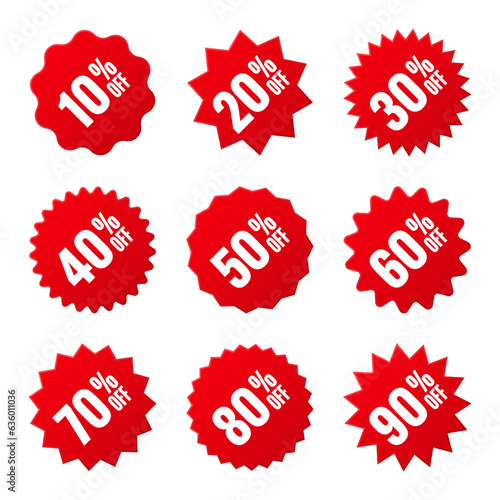 Price tags collection, special offer or shopping discount label with percent, discount percentage value. Red turned retail paper sticker. Promotional sale badge. Vector illustration