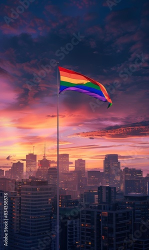 Pride flags fly over the city skyline. It is a symbol of visibility and pride for the LGBTQ+ community.