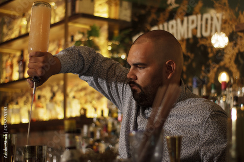 Primer plano de Barman Cantinero mexicano profesional preparando un cóctel alcohólico para los clientes en el bar o discoteca