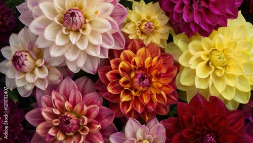 Primer plano de bouquet de Dalias, Flores de colores vibrantes