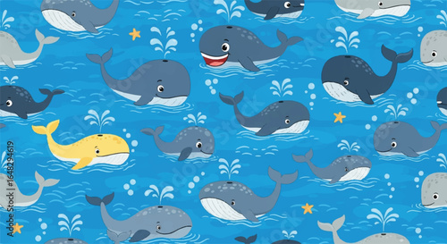 whale, ocean, sea, animal, marin, water, blue, pattern, seamless, cartoon, cute, happy, swimming, background, design, illustration, wildlife, nature, aquatic, mammal, fish, underwater, fin, tail, spout, spray, wave, ripple, bubble, star, yellow, grey, playful, childish, children, children, repeat, textile, fabric, wallpaper, wrapping, surface, decorative, fun, adorable, cheerful, vibrant, bright, simple