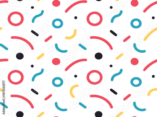 pattern, seamless, abstract, colourful, vibrant, playful, cheerful, geometric, shape, circle, ring, dot, stripes, confetti, celebration, party, festive, energetic, modern, retro, 80s, 90s, memphis, design, graphic, illustration, background, texture, textile, fabric, scrapbooking, wallpaper, decor, art, creative, whimsical, fun, bright, bold, simple, clean, white, pink, blue, yellow, red