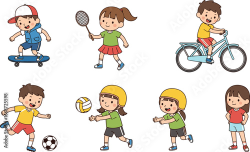 PrintChildren playing outdoor sports activities including cycling, soccer, volleyball, skateboarding, badminton, promoting healthy lifestyle, exercise, teamwork,