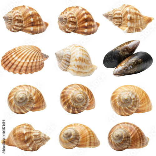 Pristine conch, scallop, mussel, and snail shells with unique patterns and subtle colors, isolated on transparent studio background with shadowless lighting. Detailed natural forms study.