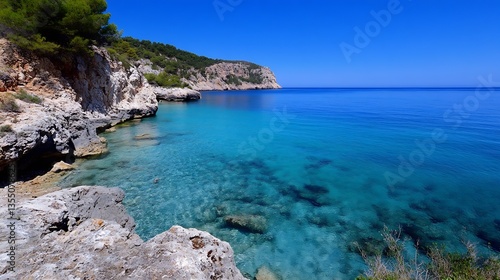 Pristine turquoise waters gently lapping against rocky shores in a serene coastal bay : Generative AI