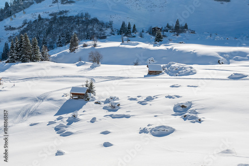 Pristine winter landscape seen from a drone, with untouched snow and breathtaking views over the Bernese Oberland mountains