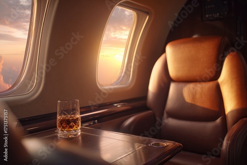 private, jet, cabin, sunset, view, window, cloud, drink, whiskey, glasses, table, seat, leather, luxury, travel, flight, aeroplane, comfort, rich, expensive, interior, design, modern, gold, warm, light, ambience, elegant, sophisticated, traveler, leisure, vacation, exclusive, comfortable, premium, aviation, destination, horizon