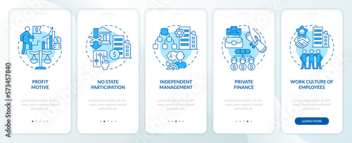 Private sector features blue onboarding mobile app screen. Business walkthrough 5 steps editable graphic instructions with linear concepts. UI, UX, GUI template. Myriad Pro-Bold, Regular fonts used