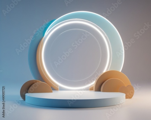dais, stage, platform, racked, display, product, circle, background, neon, light, presentation, empty, modern, minimal, design, abstract, scene, template, studio, geometric, shape, round, white, blue, orange, render, illustration, advertising, marketing, promotion, sale, retail, commerce, space, exhibition, fair, event, showcase, mock, up, copy, area, clean, elegant