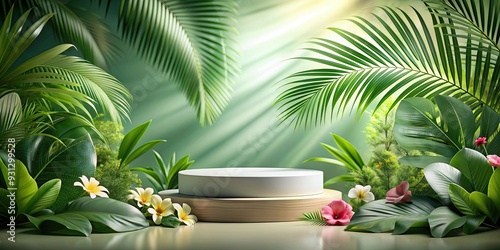 Product podium with tropical leaves and flowers on a nature background, product display, tropical, podium, leaves