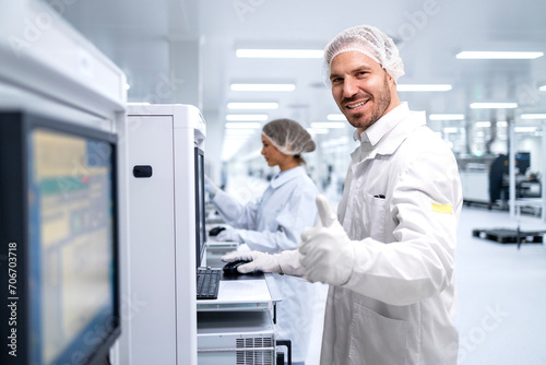 Production line worker standing by machine and holding thumbs up in automotive industry.