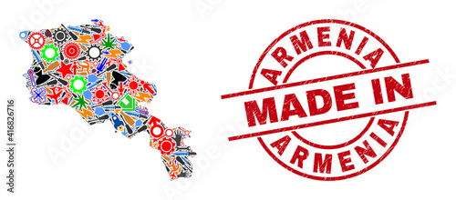 Production mosaic Armenia map and MADE IN scratched rubber stamp. Armenia map collage created with wrenches, gearwheels, screwdrivers, items, cars, electricity strikes, details.