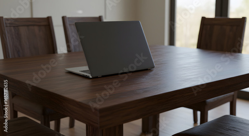 laptop, open, dining, table, work, modern, productive, wooden, home, office, remote, tech, convenience, sleek, clean, minimalist, contemporary, daily, routine, hot drink, morning, evening, study, keyboard, screen, digital, urban, chic, neutral, black, white, grey, simple, functional, organised, tidy, efficient, workspace, hybrid