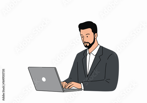 Professional Bearded Businessman Focused on Laptop Work, Minimalist Illustration on White Background