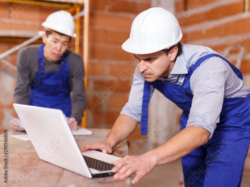 Professional builders using laptop