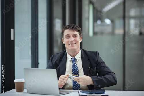 Professional business man trader using laptop computer sitting at office desk in modern office.