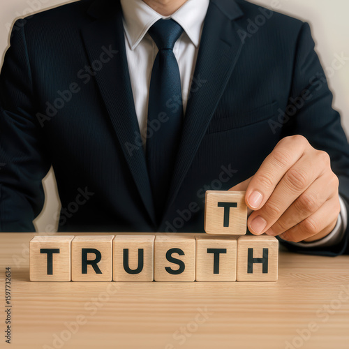 Professional Businessman Emphasizing Trust, Branding Essential with Block Lettering, Perfect for Marketing and Advertising Campaigns.