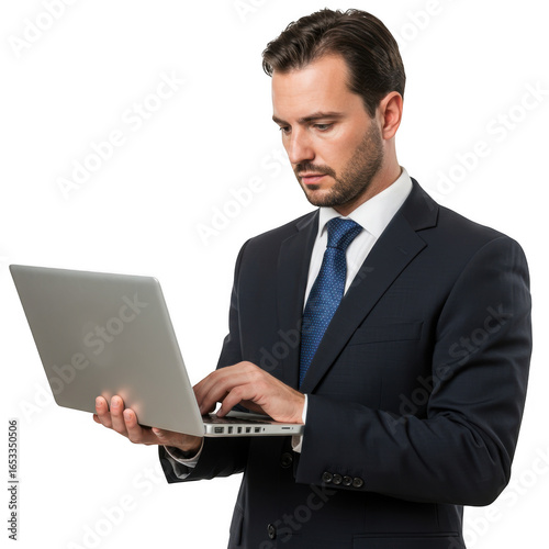 businessman, man, laptop, computer, technology, working, typing, focused, serious, professional, business, suit, attaching, shirt, white, collar, corporate, office, career, employment, job, digital, online, cyberspace, communication, datum, information, analysis, strategy, planning, development, project, task, dedication, concentration, skill, expertise, cognition, learning, education, success, achievement, male, adult, person, transparent, background