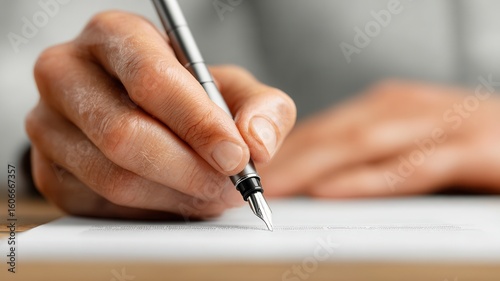 Professional businessman signing contract, hand holding wooden over pen desk surface, capturing business negotiation moment