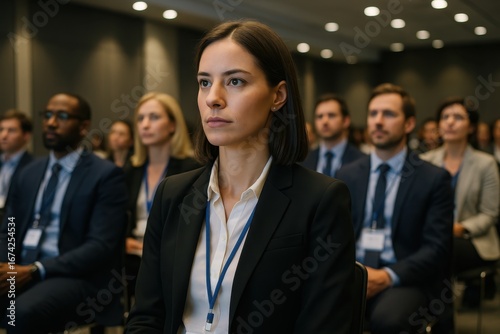 Professional businesswoman attentively participating in corporate conference with colleagues in modern auditorium