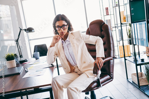 Professional businesswoman confidently working in stylish office environment wearing elegant white suit