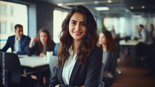 Professional businesswoman positioned at her workstation with colleagues visible in the backdrop.