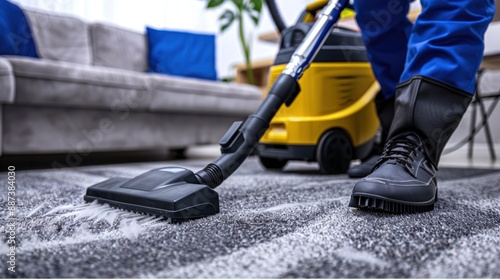 vacuum, cleaner, carpet, cleaning, housekeeping, service, home, professional, interior, domestic, household, machinery, equipment, maintenance, hygiene, cleanliness, dust, dirt, floor, room, grey, black, yellow, work, men at work, foot, shoe, boot, furniture, couch, living, design, comfort, lifestyle, residential, modern, style, contemporary, decor, comfortable, close, up, detail, sharpened, texture