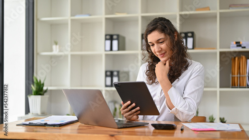 Professional caucasian businesswoman working or reading an online articles on tablet.