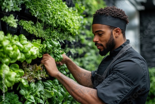 Professional chef in white uniform and apron carefully picks fresh basil from a lush vertical garden, symbolizing the integration of sustainable agriculture and gourmet cuisine.