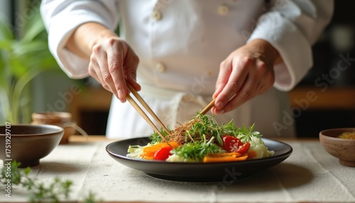 Professional chef plates fresh vegetable meal in serene kitchen. Hands delicately arrange colorful seasonal plant food ingredients using chopsticks. Japanese culinary art mindful preparation of