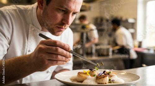 Professional chef plating gourmet dish with tweezers in restaurant kitchen
