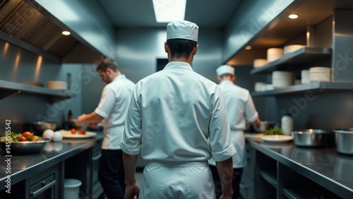 chef, eatery, food preparation, cooking, cook, kitchen, professional, culinary, team, teamwork, backview, uniform, stainless steel, industrial, workspace, preparation, male, man, indoor, indoor, work, employment, occupation, culinary arts, gastronomy, healthy eating, food industry, hospitality, catering, dining, interior, working, equipment, appliance, ventilation, steel, modern, blur, blurred, anonymous, detail, day, contemporary