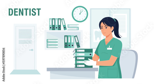 dentist, dental, office, assistant, file, document, health care, hygiene, teeth, record, medicals, men at work, uniform, woman, clock, schedule, clinic, folder, organiser, workplace, desk, paper, task, indoor, job, profession, administration, staff, receptionist, appointment, timetable, daily, activity, routine, management, career, specialist, expert, business, occupation, service, expertise