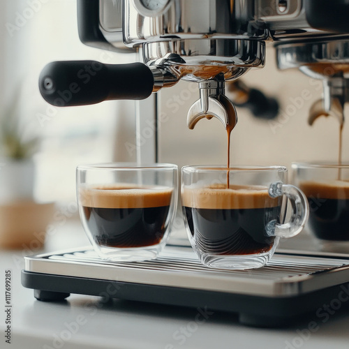 Professional espresso machine pouring rich coffee into two glasses on a modern kitchen countertop with a bright background and reflections, coffee shop style