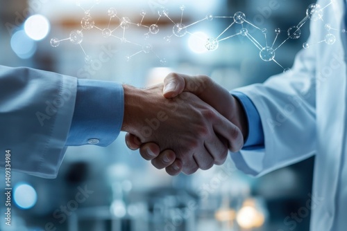 Professional Hands Shaking in Laboratory Setting with Scientific Elements and Molecular Structures, Symbol of Collaboration and Innovation in Research Environment
