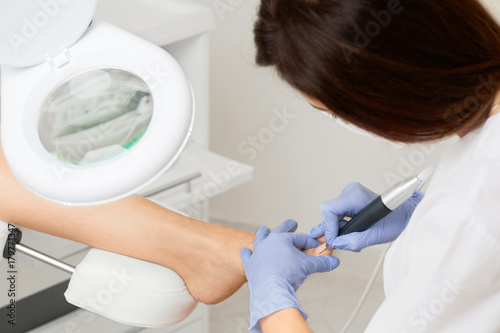 Professional hardware pedicure using electric machine.Patient on medical pedicure procedure, visiting podiatrist.Peeling feet with special electric device.Foot treatment in SPA salon.Podiatry clinic.