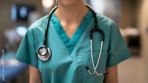 Professional healthcare worker in scrubs with stethoscope ready to assist patients in a medical facility environment, showcasing dedication and care in modern medicine.