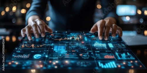 Professional Holding Virtual Interface with Payroll and Financial Icons, Concept of Modern Payroll Management Systems, Generative AI