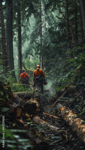 Professional Logging Team at Work in Dense Forest Using Chainsaws for Efficient Tree Felling and Logging